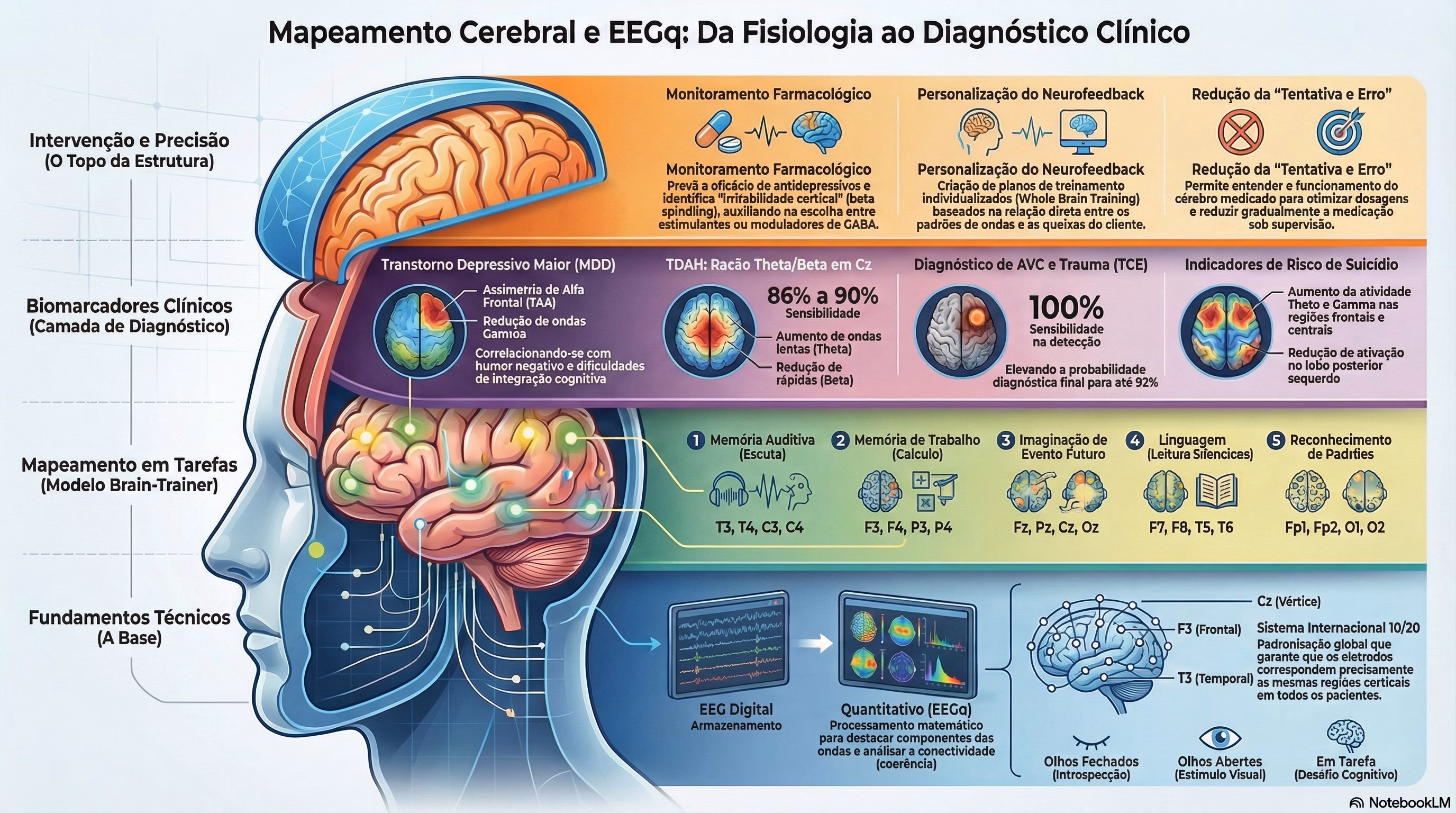 As evidências atuais, metodologias e aplicações clínicas do Eletroencefalograma (EEG) e sua vertente quantitativa (EEGq), também referida como mapeamento cerebral. A análise abrange desde o uso em transtornos neuropsiquiátricos até o monitoramento de respostas farmacológicas e intervenções como o neurofeedback.