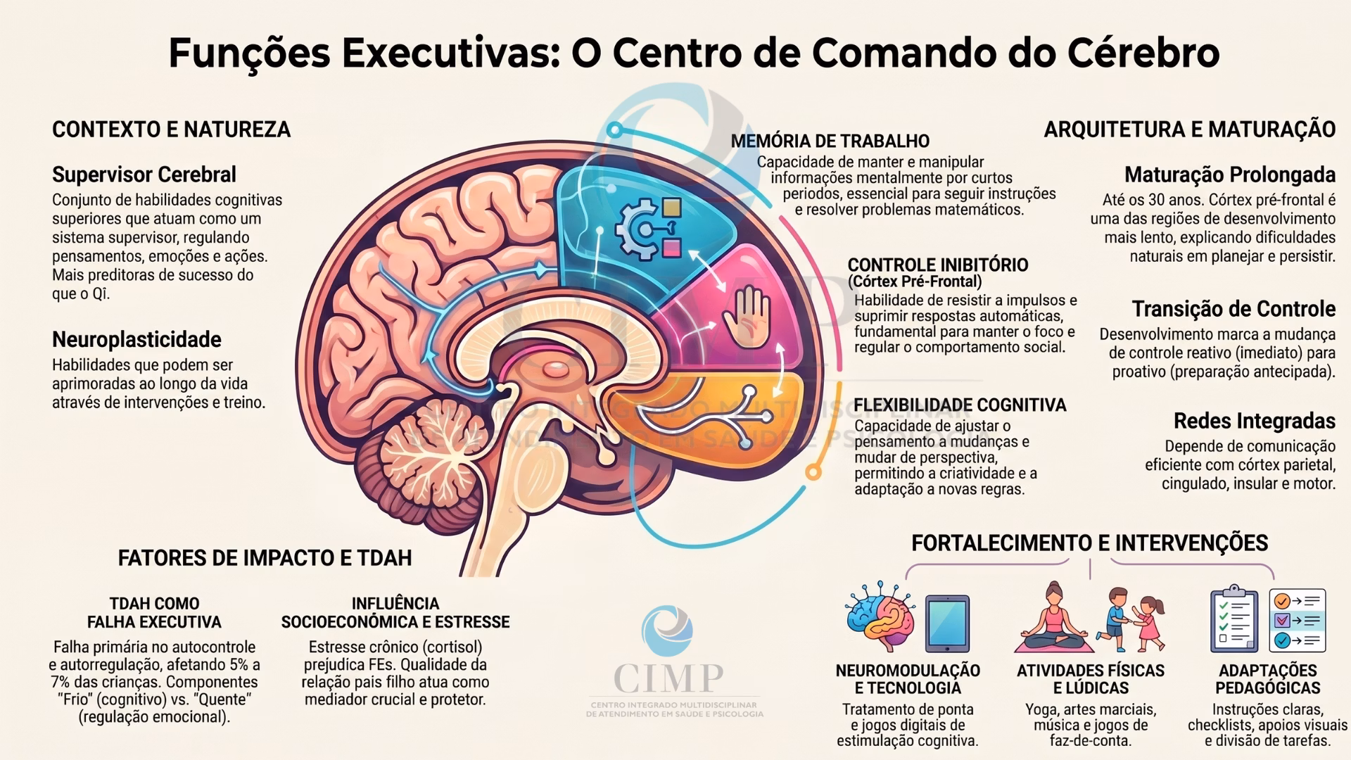 • Cronologia de Maturação: As funções executivas continuam a se desenvolver até a terceira década de vida (20 a 30 anos). Isso explica por que crianças pequenas têm dificuldades intrínsecas em planejar, persistir em tarefas e resistir a guloseimas.