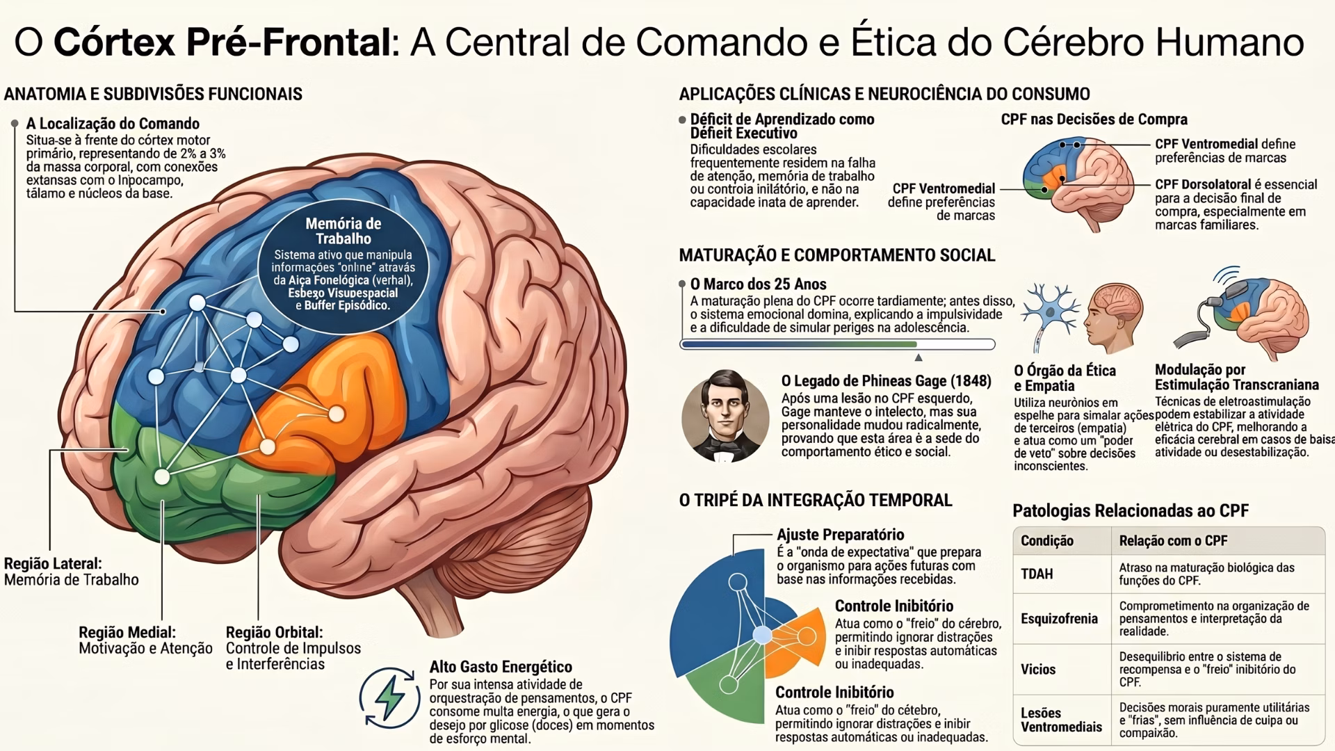 O Caso Phineas Gage (1848): Um marco na neurociência. Após uma barra de ferro destruir seu Córtex Pré-Frontal esquerdo, Gage sobreviveu com intelecto e linguagem intactos, mas sua personalidade mudou radicalmente. Tornou-se irreverente, impaciente e incapaz de seguir normas sociais, provando que o CPF é a sede do comportamento ético e social. Leia clicando aqui sobre as áreas de Brodmann