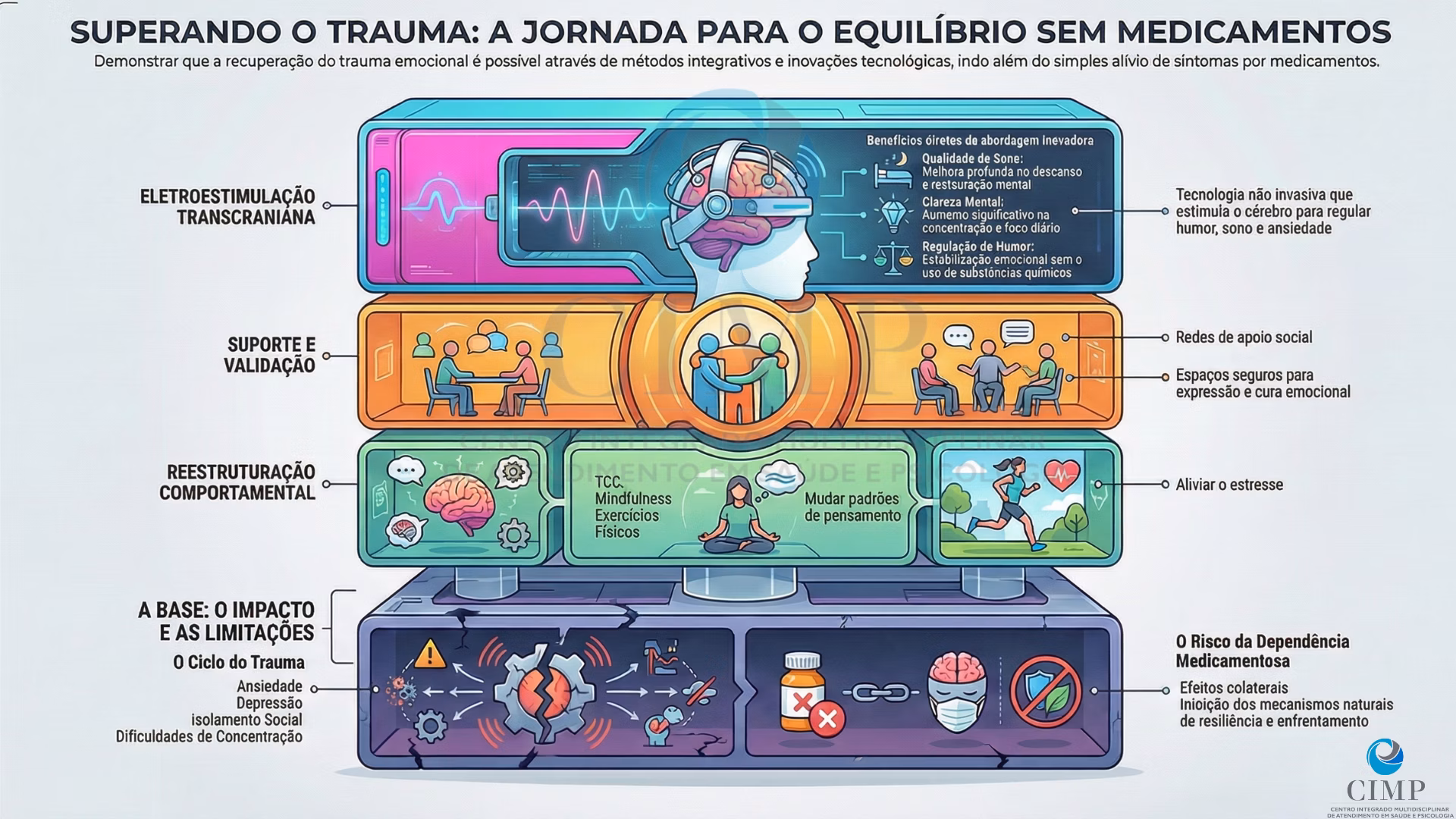 Além das abordagens tradicionais, a CIMP oferece tratamentos inovadores que têm se mostrado eficazes na recuperação de traumas. Um desses tratamentos é a eletroestimulação transcraniana, que utiliza estímulos elétricos para modular a atividade cerebral e promover a recuperação emocional.