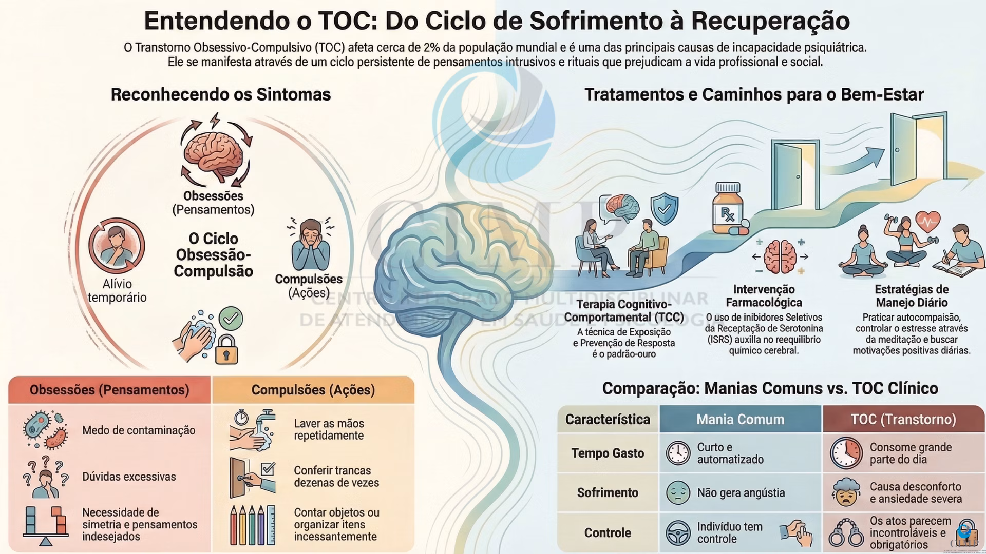 Diferenciação: É necessário distinguir o TOC de Transtorno de Ansiedade Generalizada (TAG), Espectro Autista, Transtorno de Tiques, Síndrome de Tourette e Transtorno de Personalidade Obsessivo-Compulsiva.